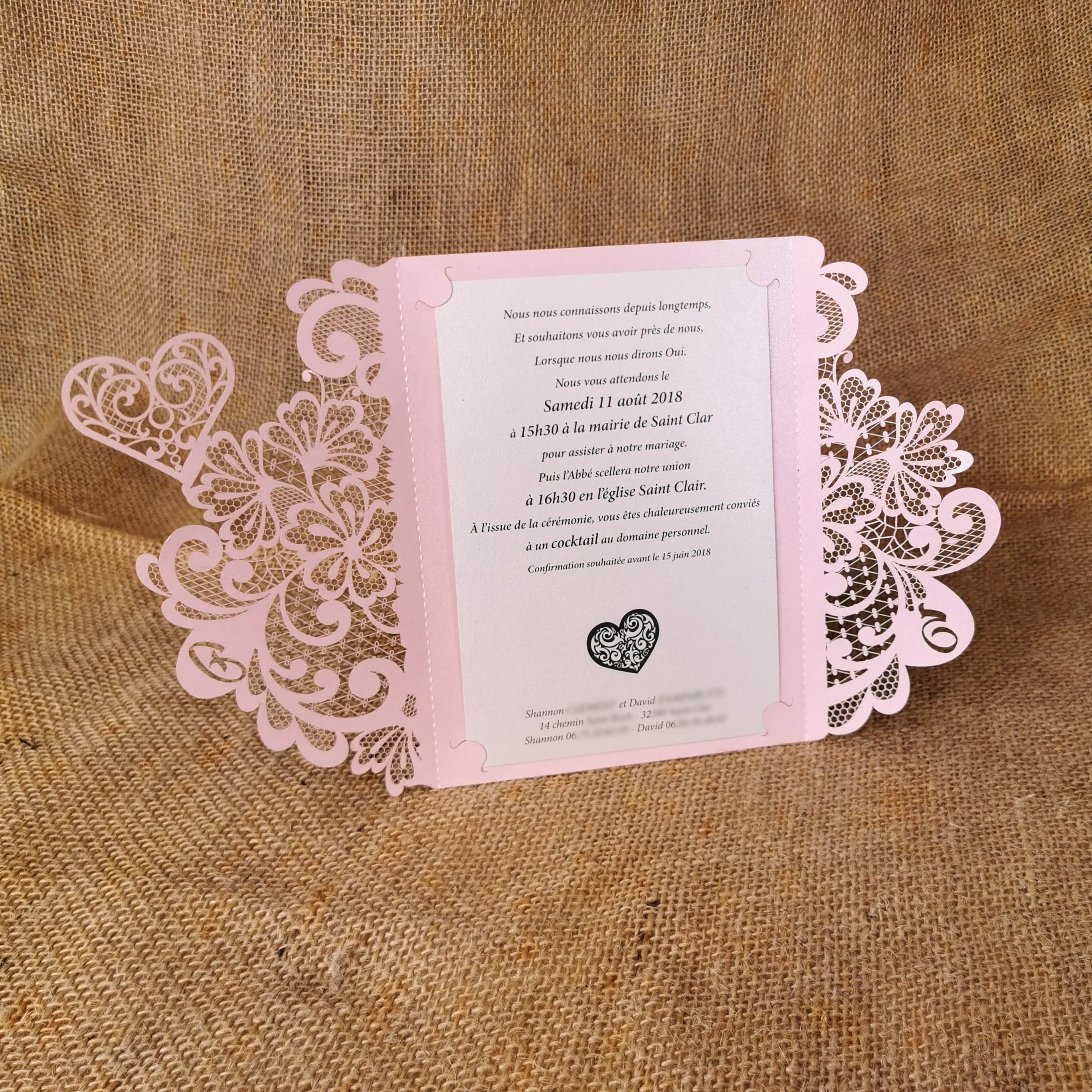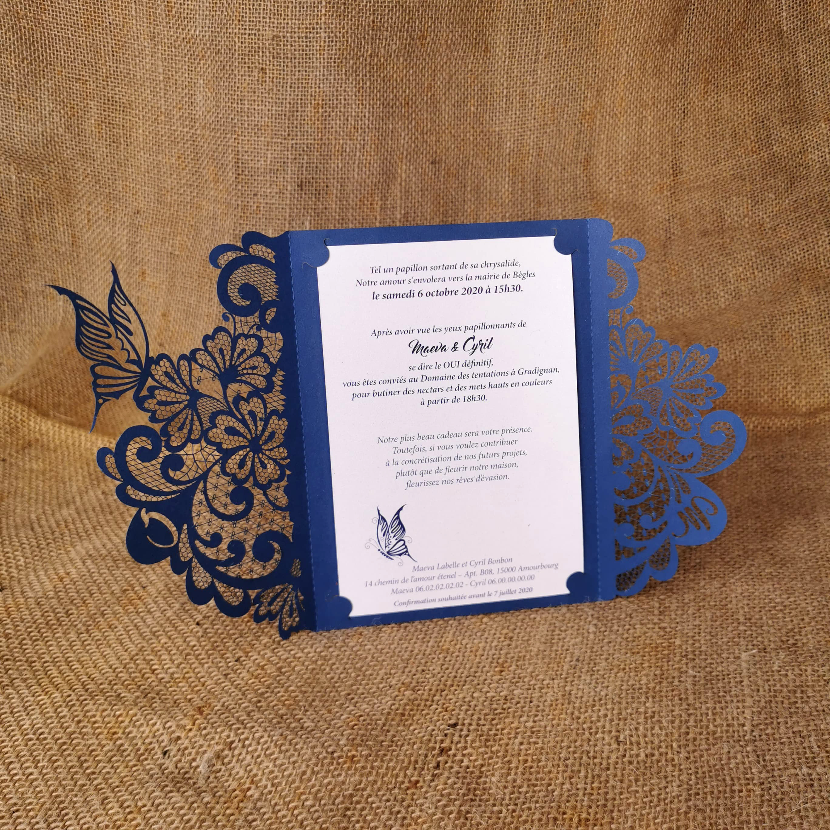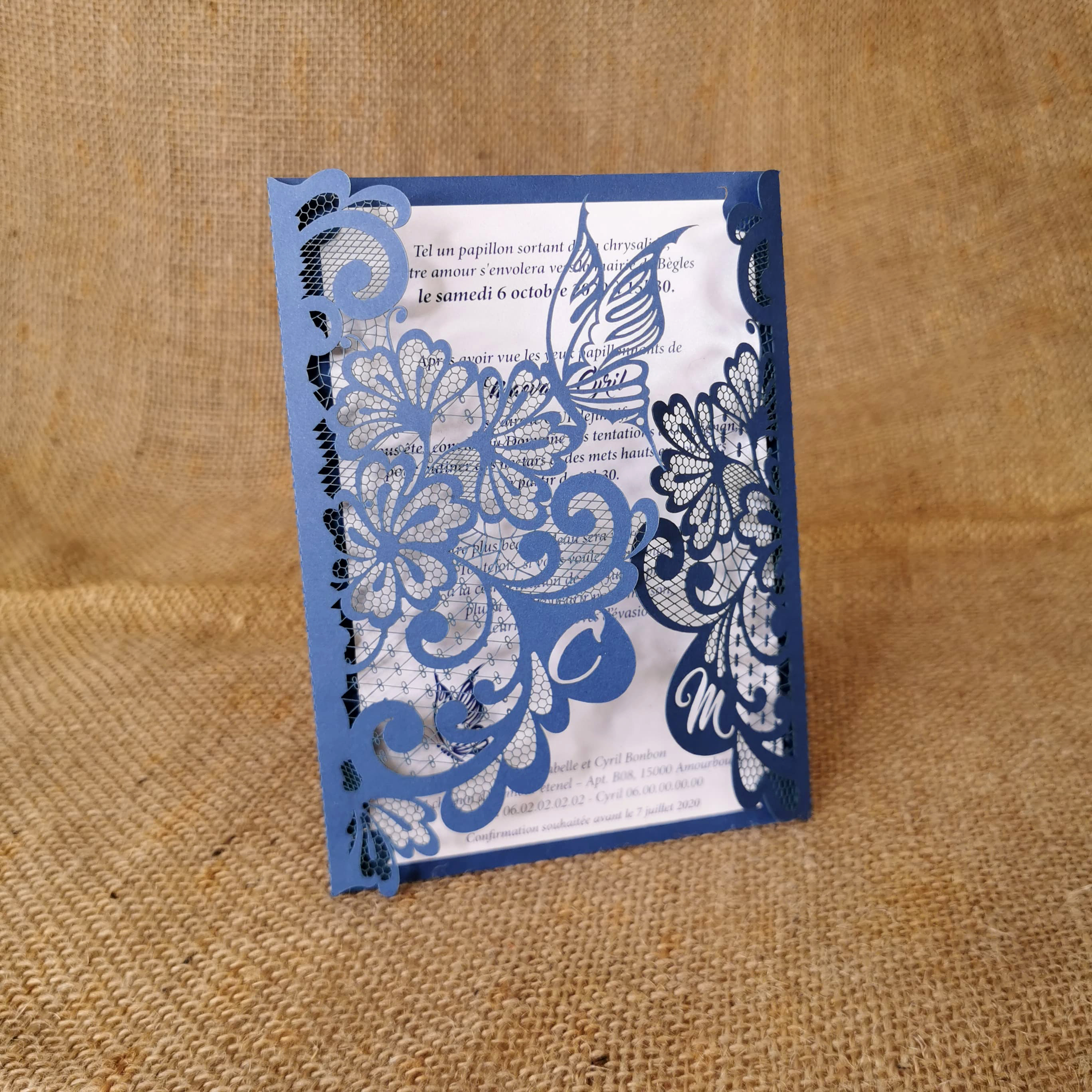 La finesse de la dentelle obtenue sur papier grâce à la découpe laser fera de votre faire-part un symbole de délicatesse. Vos initiales, des fleurs, un papillon, un coeur… avec ou sans ceinture, ce faire-part raffiné et élégant est disponible dans un grand choix de papier.