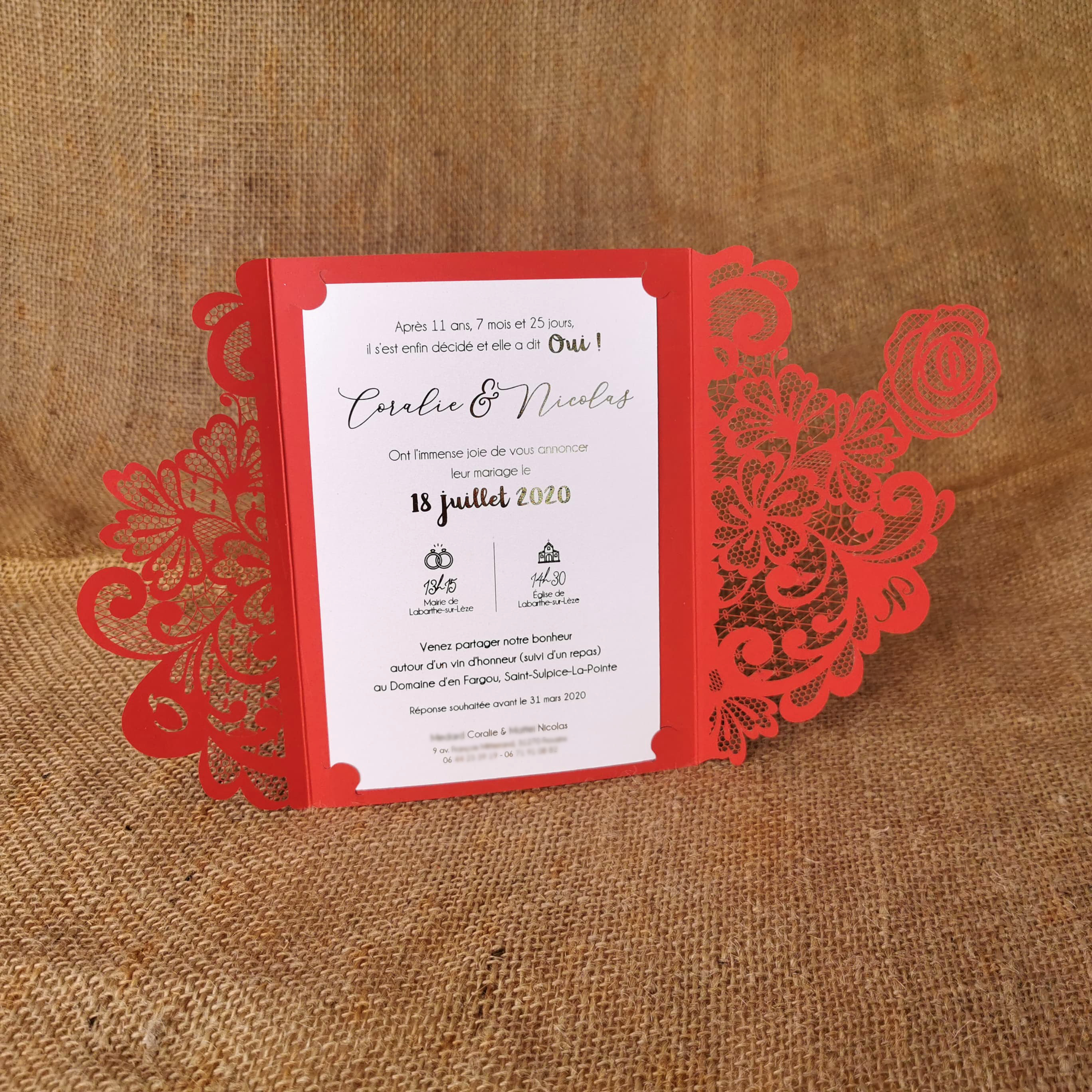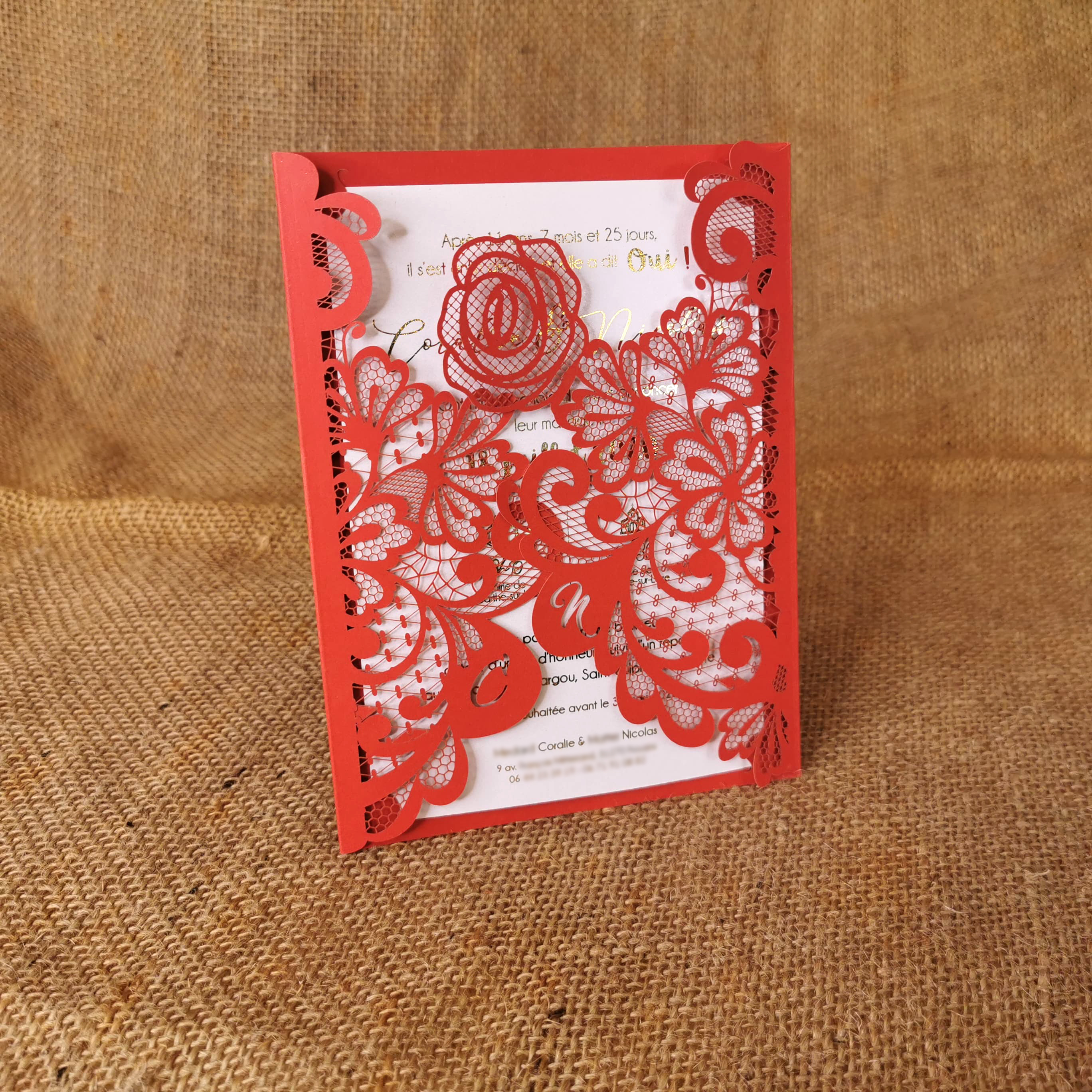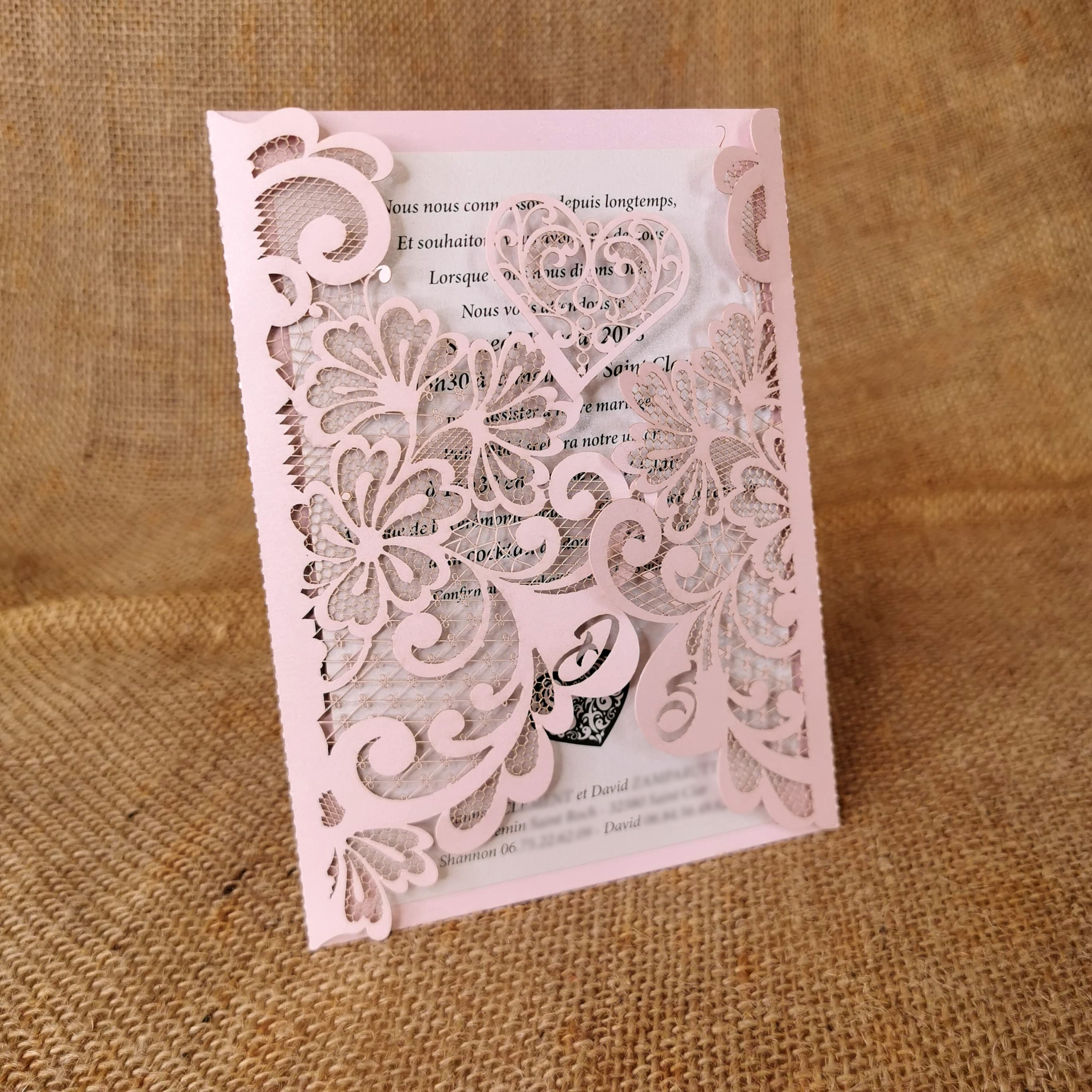 La finesse de la dentelle obtenue sur papier grâce à la découpe laser fera de votre faire-part un symbole de délicatesse. Vos initiales, des fleurs, un papillon, un coeur… avec ou sans ceinture, ce faire-part raffiné et élégant est disponible dans un grand choix de papier.