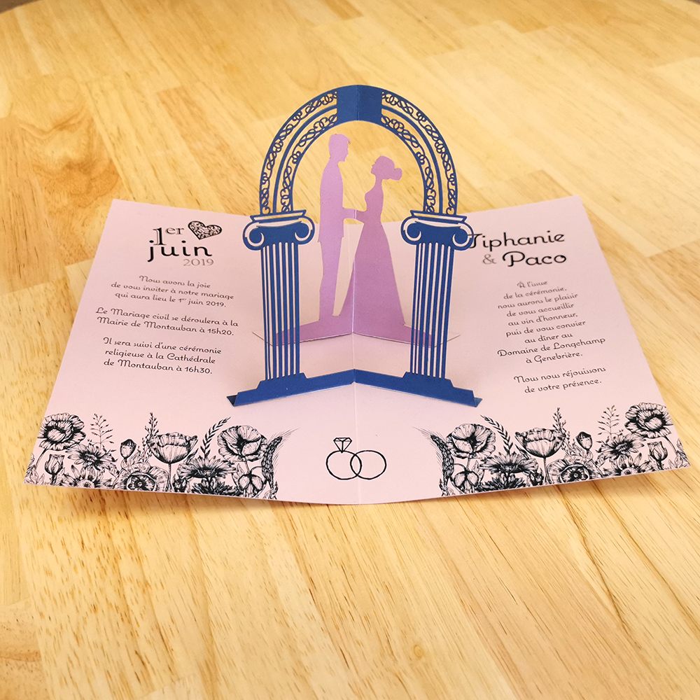 On ouvre une simple carte et on découvre des personnages qui se dressent. C’est la magie de nos livres d’enfants retrouvée : l’art du pop’up. Une touche de féerie pour annoncer votre mariage.